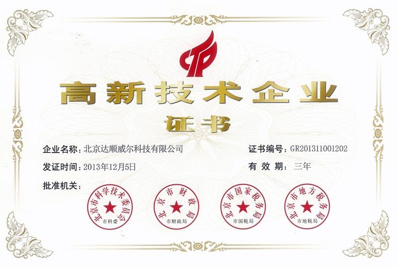经过北京市科学技术委员会的审核,特授予我公司“高新技术企业”称号,并颁发证书。